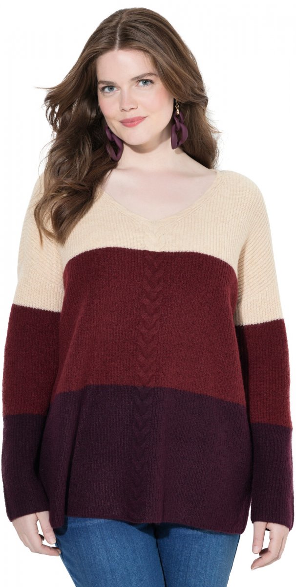 Guía de tallas - Ulla Popken Cable Knit Block Stripe V-Neck Sweater Dark Ruby